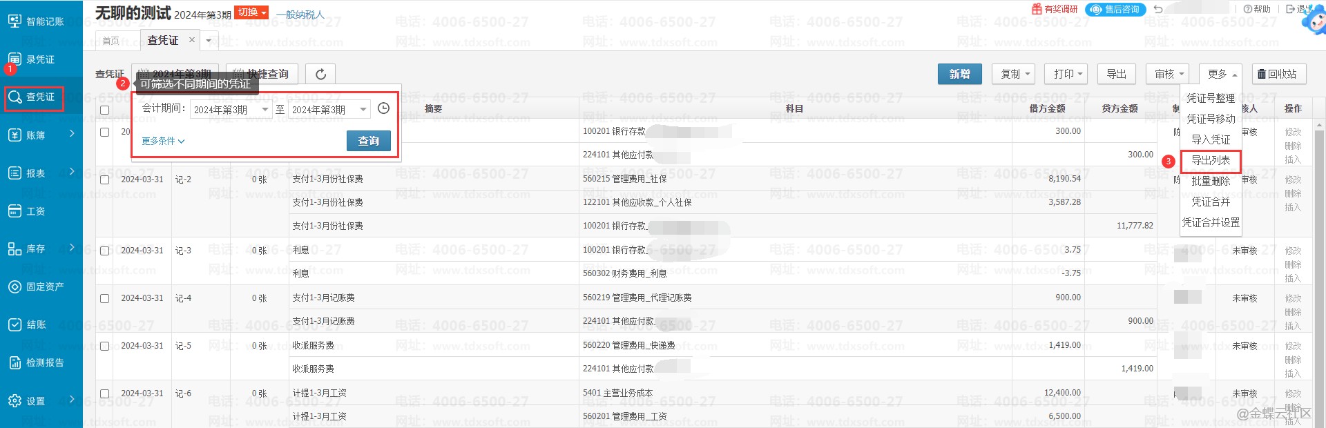 进入账簿后,在左边菜单【查凭证】界面选择期间点击【查询】; 筛选对应的凭证出来后点右上角【更多】→【导出列表】即可。