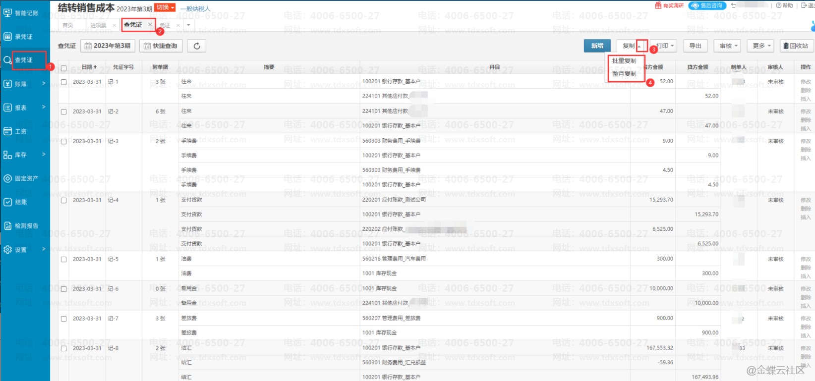 在【查凭证】的右上角【复制】选【批量复制】或【整月复制】到当期或后面期间。