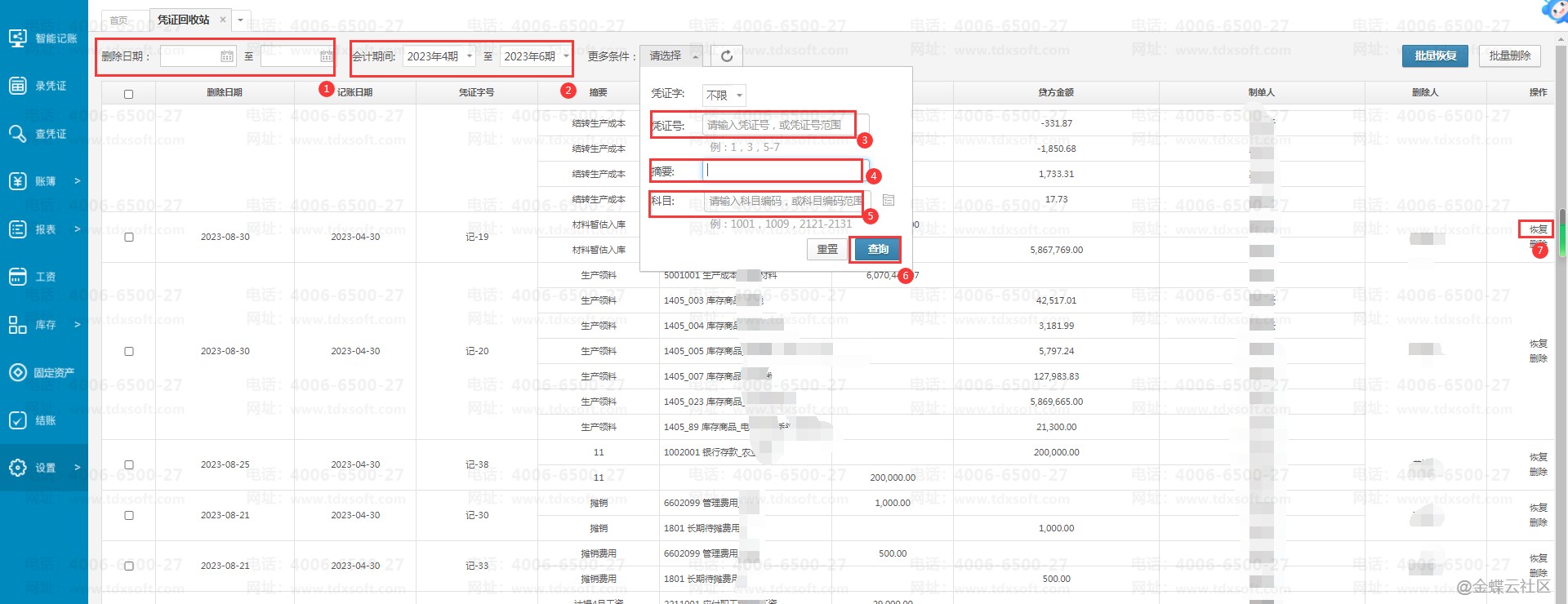 2.打开凭证回收站界面后,可根据【删除日期】、【会计期间】、【凭证号】、【摘要】、【科目】等要素来进行筛选查询,查询到对应期间的凭证后点击【恢复】或者是勾选多张凭证,点击右上角【批量恢复】按钮。