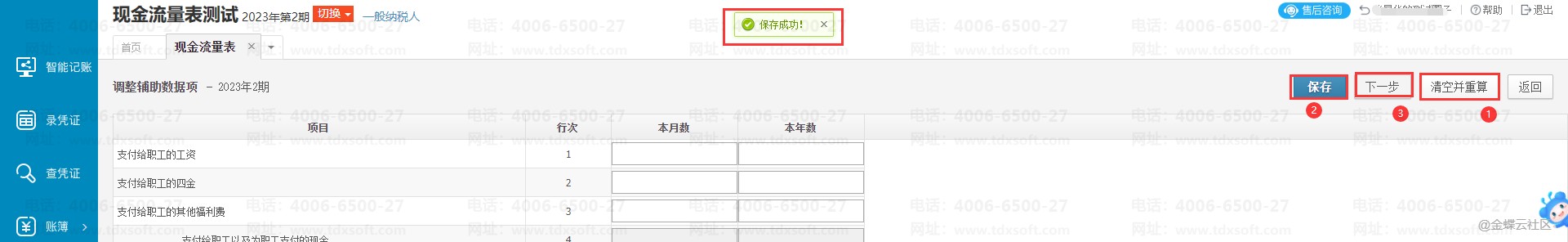 2.进入现金流量表的辅助数据项调整页面,点击右上角【清空并重算】→【保存】,确认点击【下一步】。