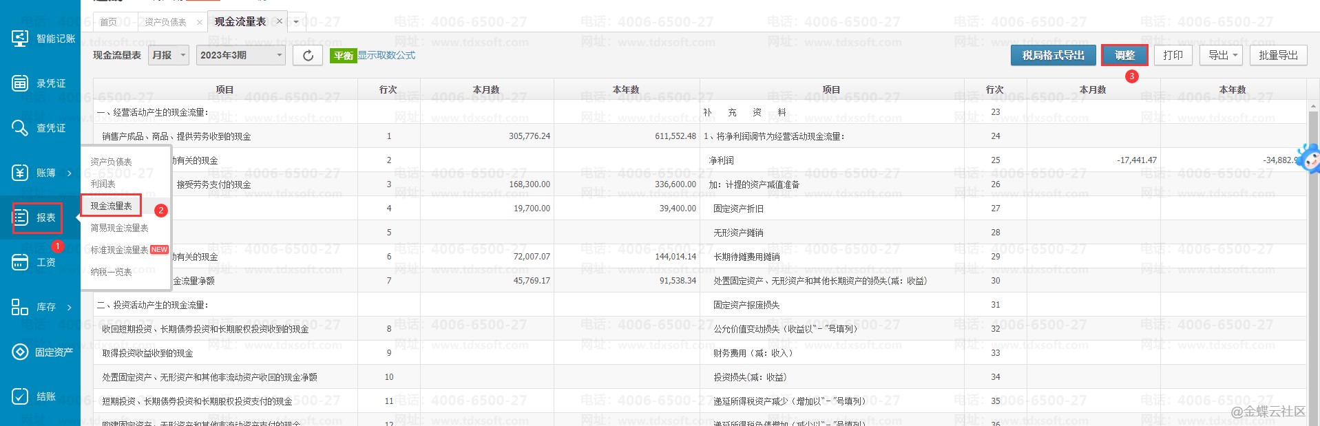 1.进入账簿,点击【报表】→右侧栏选择【现金流量表】,点击右上角【调整】。
