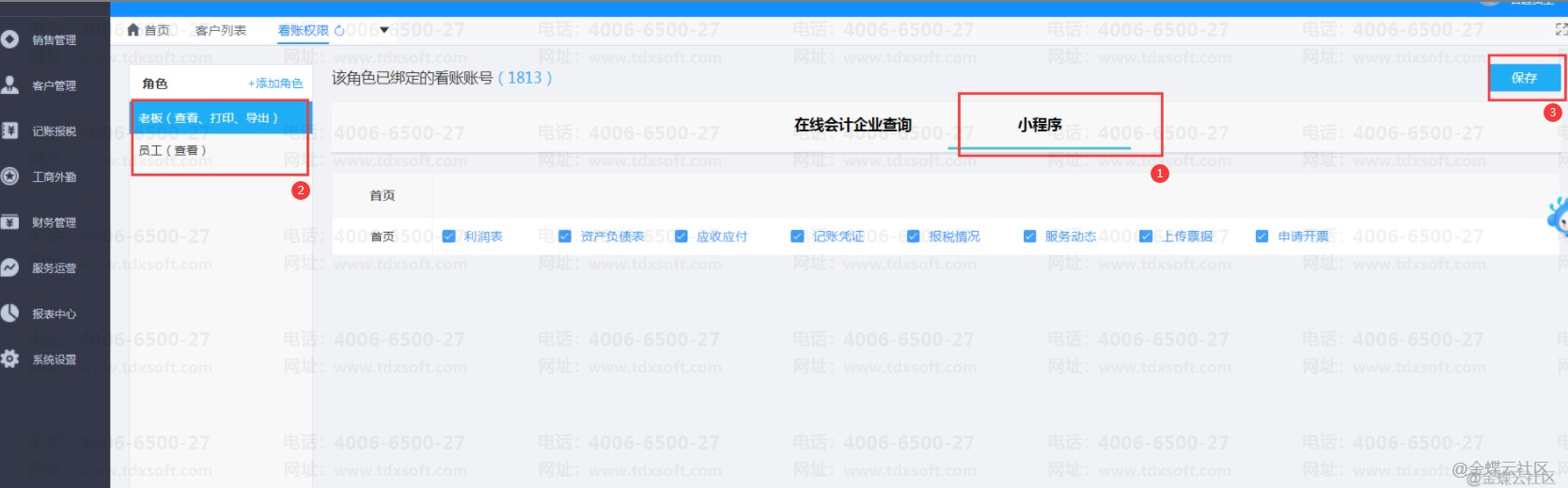 选择【在线会计企业查询】后选择好需要对应修改权限的角色,进行勾选或者取消对应的权限,最后点击保存。