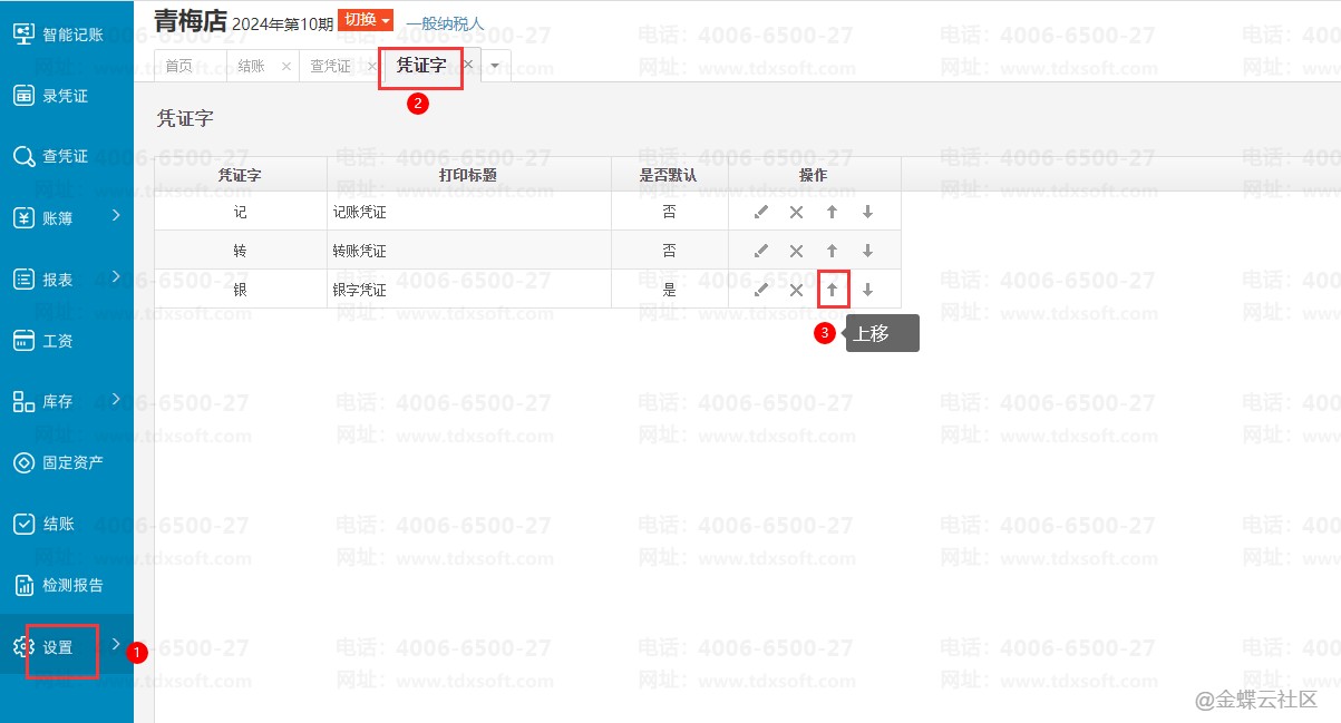 点击【设置】→【凭证字】,在界面可以看到凭证字的排序,通过操作上移或下移箭头可以调整凭证字的排序,调整完成后返回查凭证界面刷新界面,查凭证界面的凭证字号排序会按照凭证字界面的排序调整。