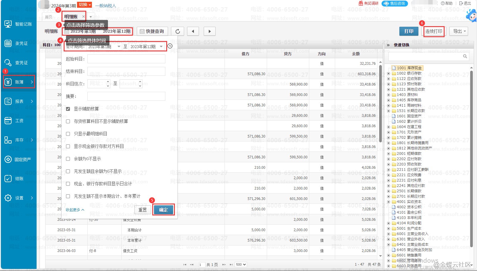进账套后点击【账簿】→【明细账】,在明细账界面点击明细账后面的期间,筛选期间选择会计期间为2023.01-2023.12的期间,再点击【确认】,数据筛选出来之后点击【连续打印】即可打印所有科目一年的明细账