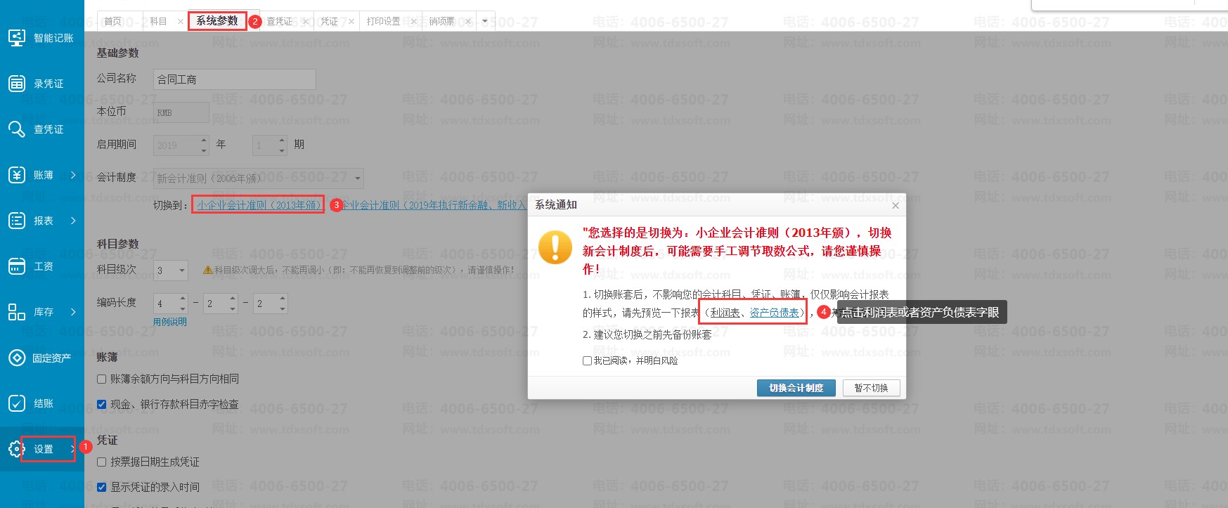 如想查看对应会计制度的报表样式可以进账簿后点击【设置】→【系统参数】→【会计制度】下点击蓝色会计制度字眼,然后点击“利润表”或者“资产负债表”字眼会跳转到选择会计制度的报表样式预览界面。
