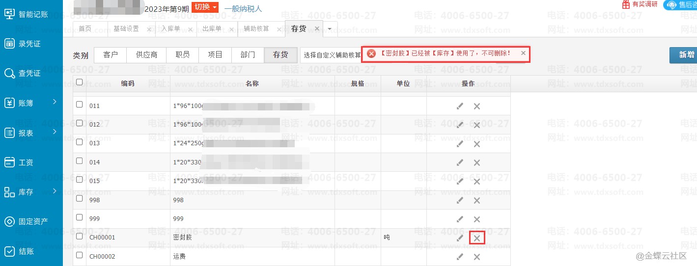 出现该提示需要去检查账套内涉及需删除的存货明细是否在库存模板有数据,例如录入了库存初始数据、出入库单情况,就需要将该存货明细的数据删除。例如需要将存货明细名称为密封胶删除,系统提示已被【库存】使用,但需要删除该商品,具体操作如下: