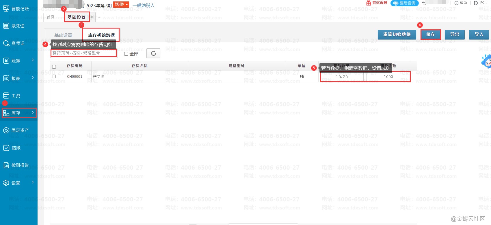 ①、查看库存初始数据是否录入。点击【库存】→【基础设置】,进入【库存初始数据】页面,筛选需要删除的存货明细,查看初始数量和初始金额列是否有数据,若是存在数据需要将数据清空或者设置成0之后点击【保存】按钮。