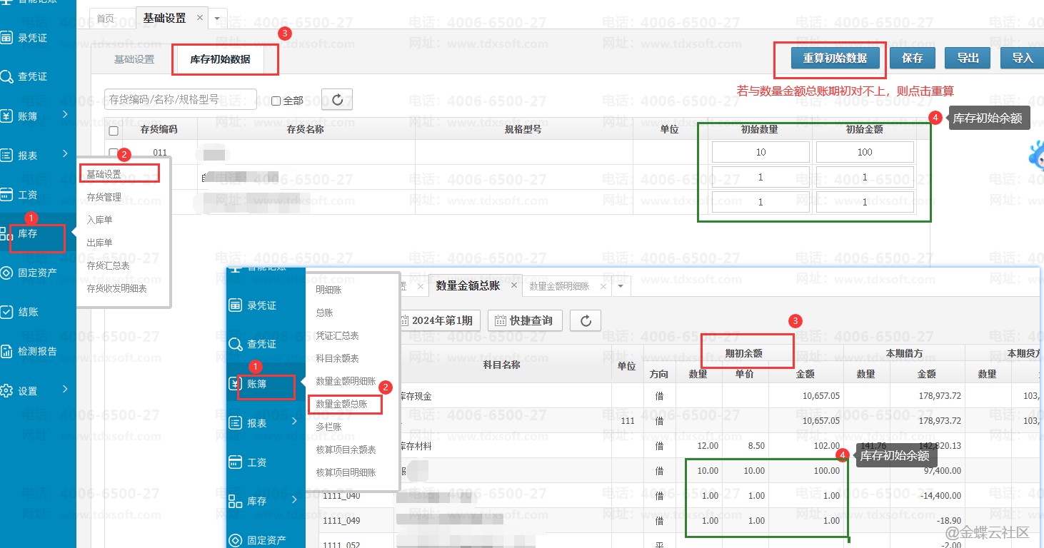 【库存初始数据】取【库存启用期间】数量金额总账中的期初数据,如:库存从5月启用,库存初始数据则取数量金额总账中5月的期初数量和金额,若两者不符,可点击【重算初始数据】。