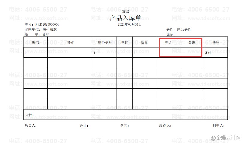 效果预览如下:【单价】【金额】显示为空。