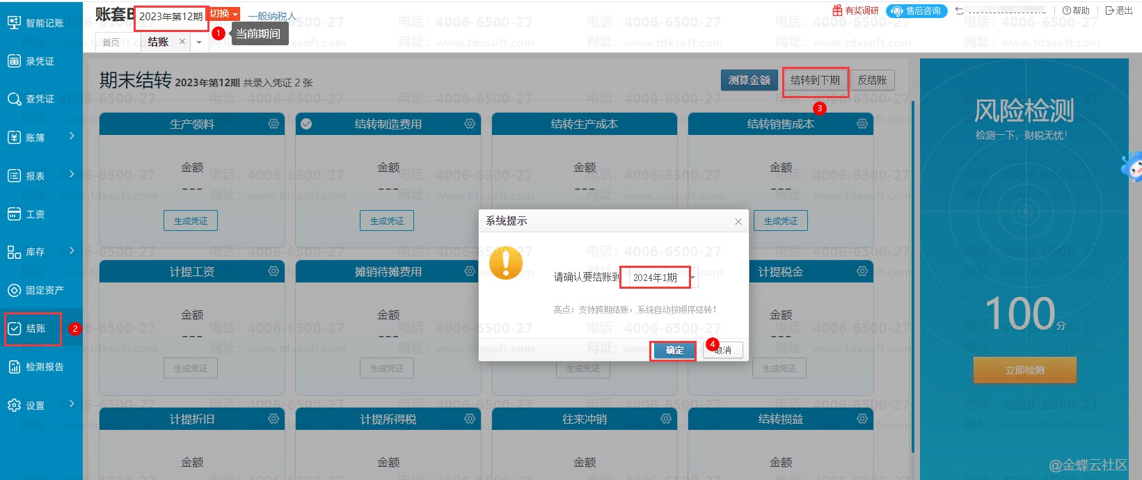 1.如当前会计期间是2023年第12期,结平损益后,点【结转到下期】按钮,选择结账到下一期:2024年第1期,即可进入到新的一个会计期间。