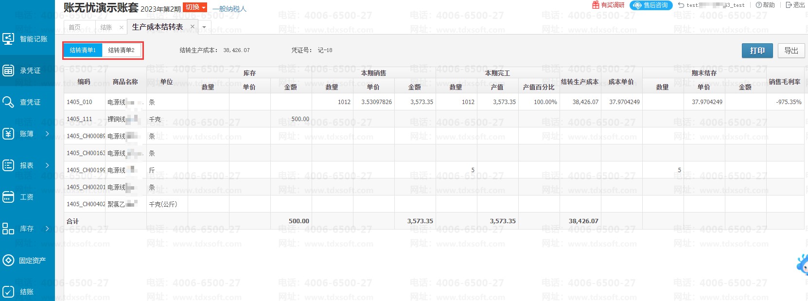 进账簿点击【结账】,在结转生产成本模块上点击【查看结转表】,在生产成本结转表界面点击左上角的“结转清单1”“结转清单2”切换查看即可