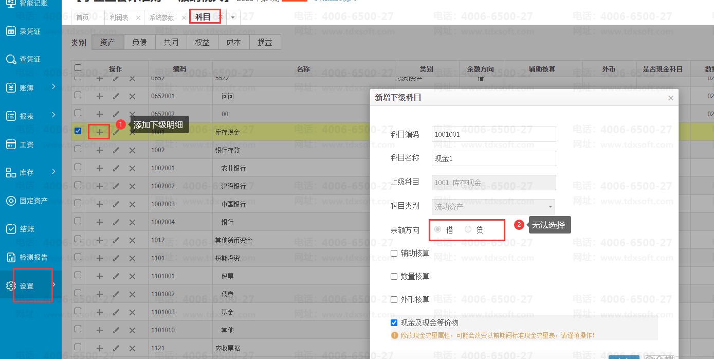 方案一、新增完第一个下级科目后,继续新增第二个下级科目,这个第二个下级科目就可以设置不同的科目余额方向了