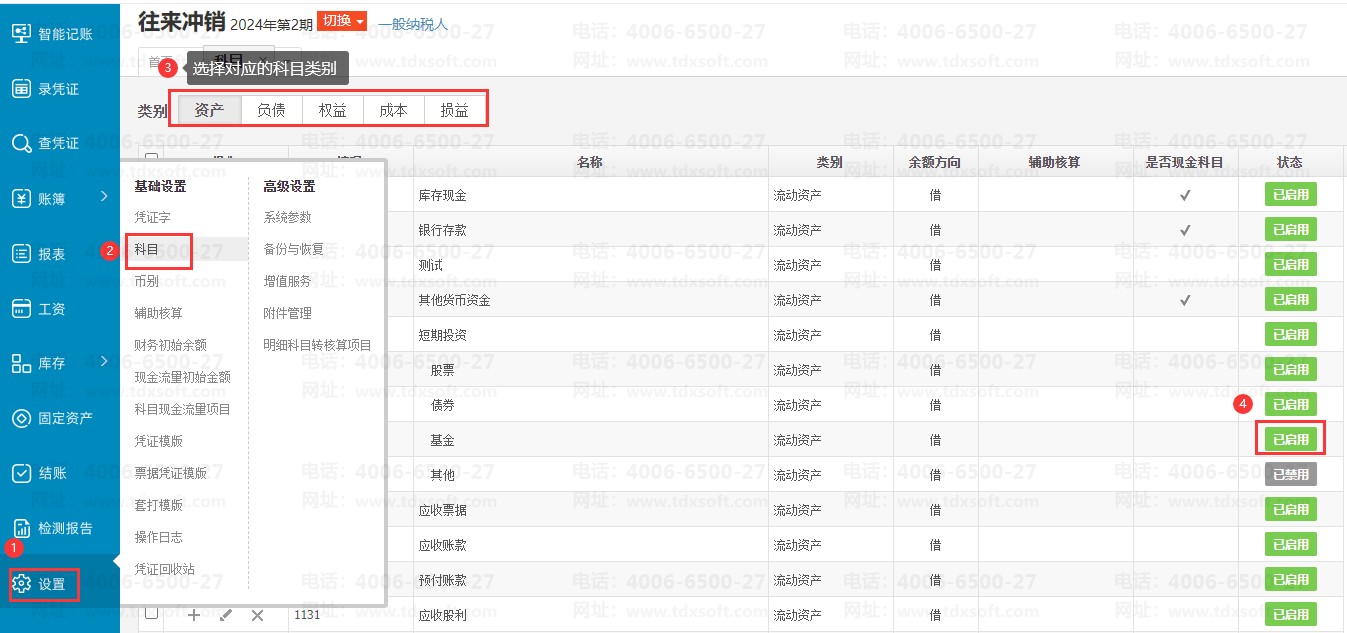 进入账套在【设置】→【科目】里,找到要禁用的科目,点击科目后面【已启用】的按钮,使得其变成【已禁用】。