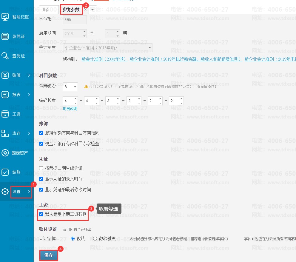 点击【设置】→【系统参数】,往下滑找到工资这行,取消勾选“默认复制上期工资数据”,点击【保存】即可完成操作。