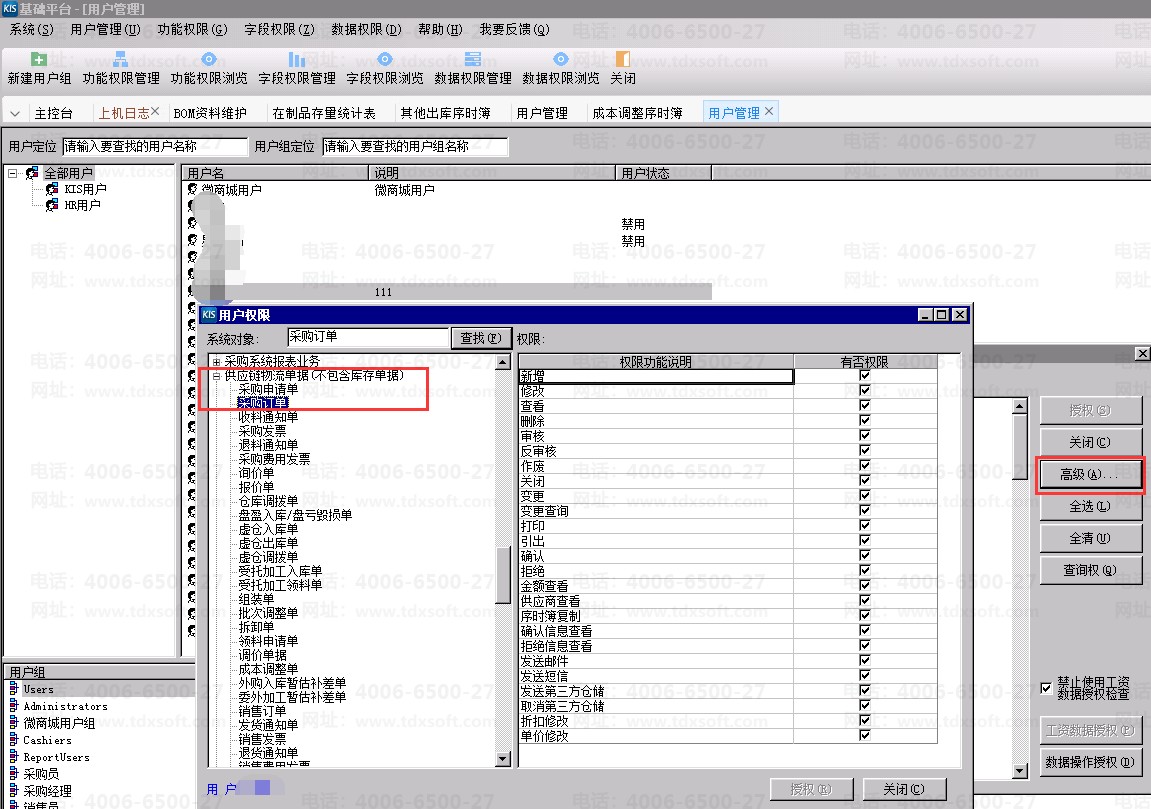 2、选择对应用户,选择【功能权限管理】-【高级】,找到【供应链物流单据(不包含库存单据)】下的采购订单,授予对应权限即可。