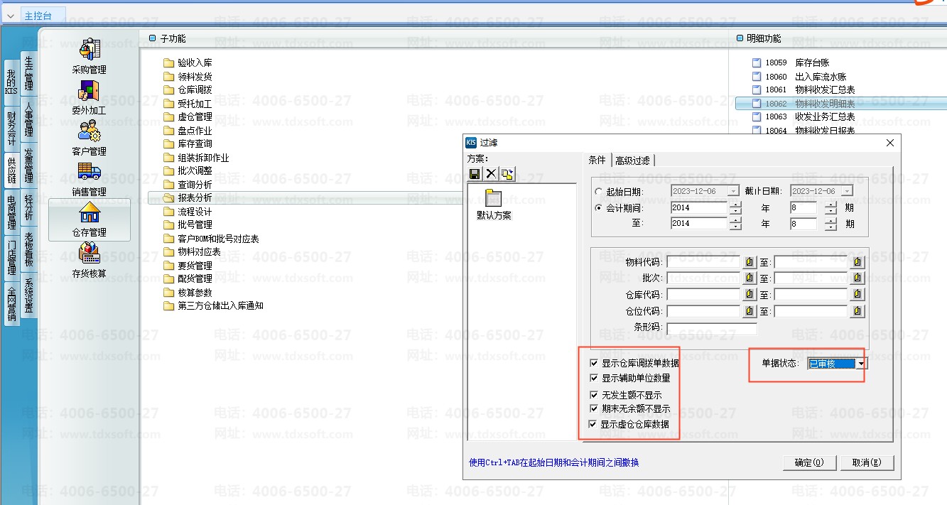2、物料收发明细表除了日期范围控制以外,还可以检查一下过滤条件参数。