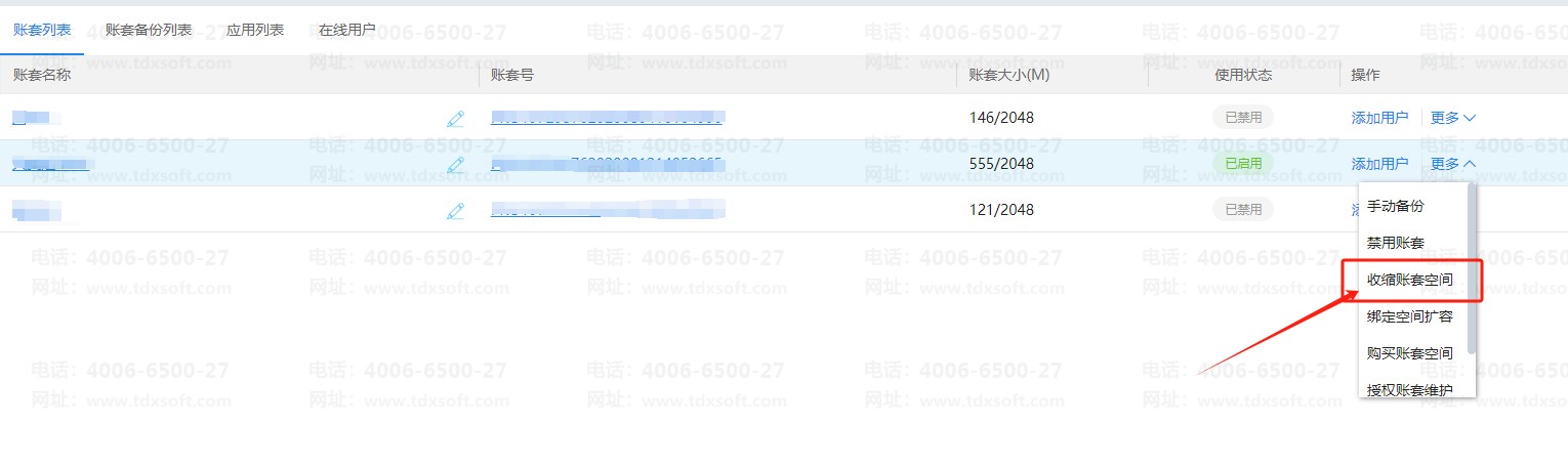 可先尝试收缩账套大小,使用产品绑定的超级管理员账号登陆kisyun.kingdee.com-点击[进入企业]-进入[账套列表]-选择对应账套最右侧[更多]-[收缩账套空间]