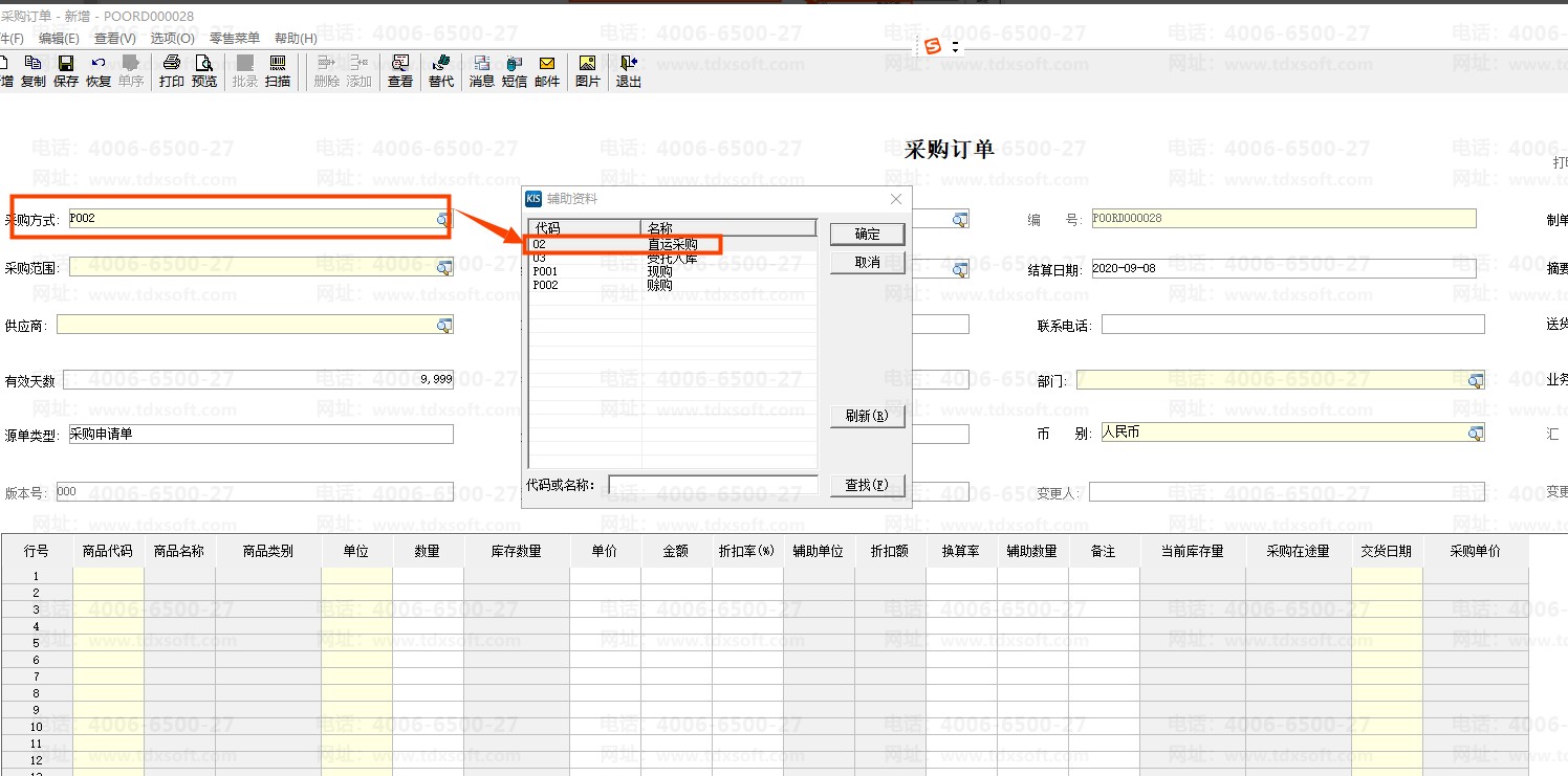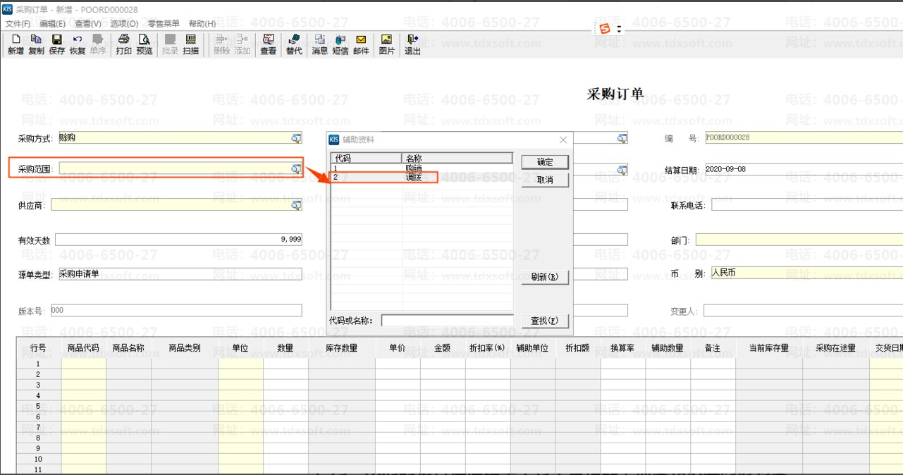 其次,采购订单的【采购方式】为【直运采购】或者【采购范围】为【调拔】的,不能下推外购入库单