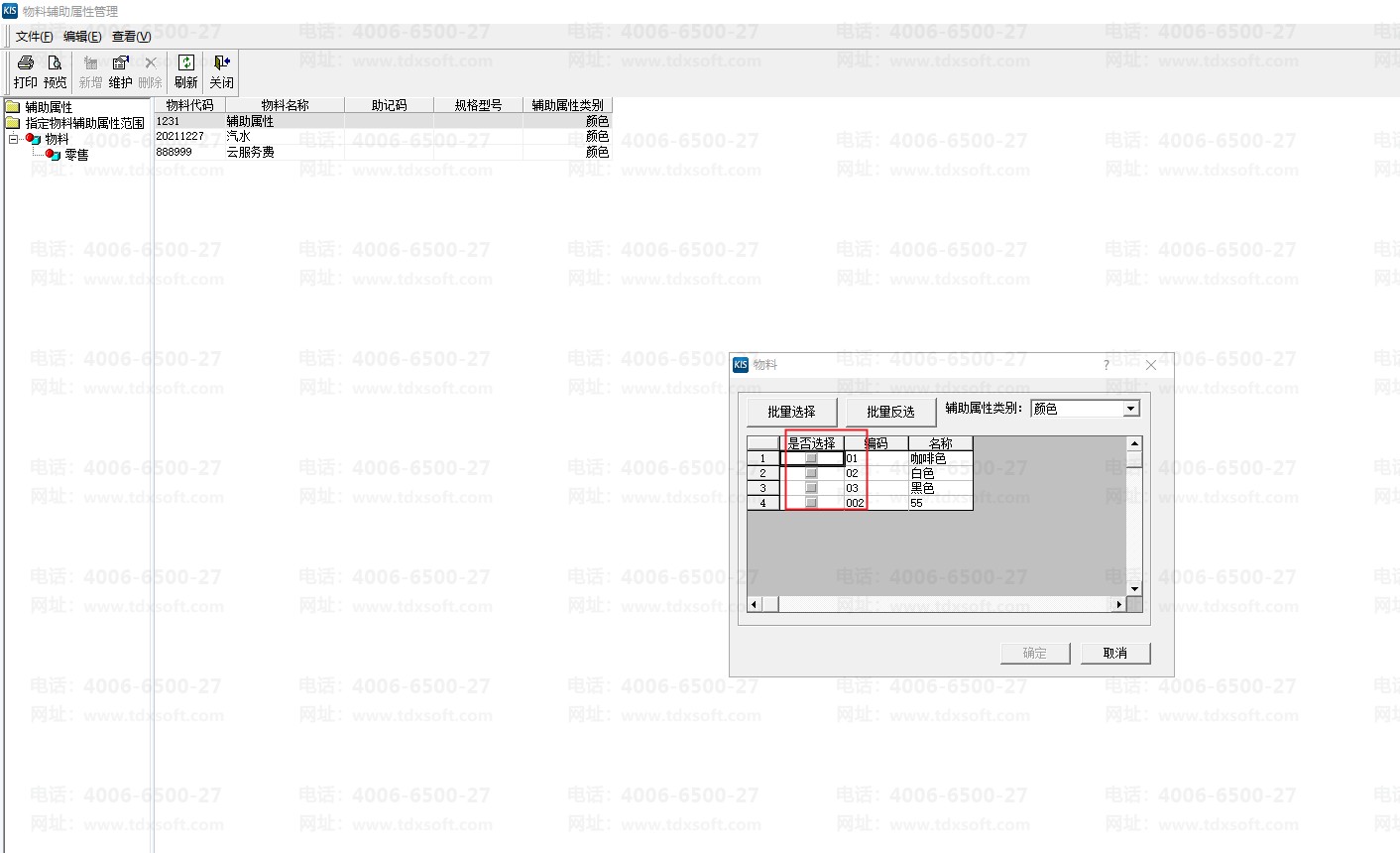 (2)在物料基础资料页勾选启用辅助属性管理后,选择物料辅助属性类别,进入采购订单录入界面,在辅助属性栏内按F7,可自定义新增物料的辅助属性。