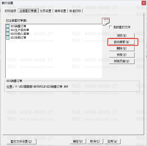 4、在【套打设置】界面中,选择【注册套打单据】页签,点击“自动搜索”,将“套打文件”进行注册;