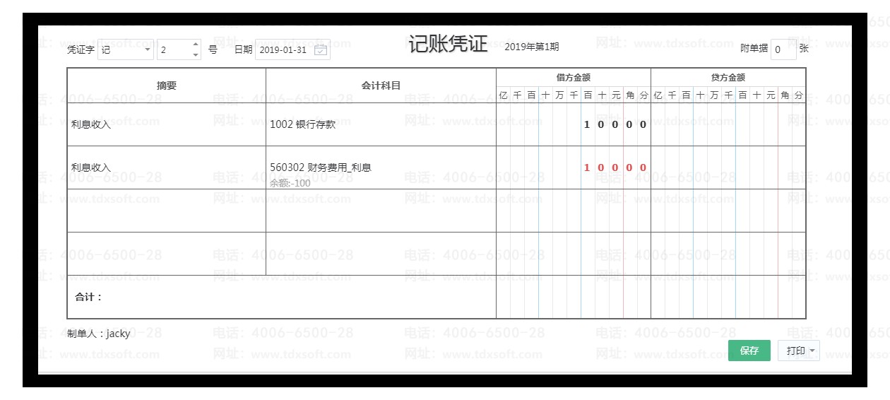 例如:收到利息收入100,因为财务费用-利息的余额方向为借方,因此录入凭证为借方红字100(-100),而不能录入贷方正100