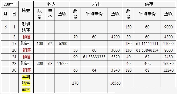 从表中可看出,采用全月一次加权平均法时,本期发出存货的平均发出成本=(月初存货结存成本+本月存货收入总成本)/(月初存货结存数量+本月存货收入总数量)=(9000+19800)/(150+300)=28800/450=64,本月发出存货总数量=270,据此计算本期发出存货总成本=64*270=17280元,本期期末成本=(月初存货结存成本+本月存货收入总成本-本期发出存货总成本)=9000+19800-17280=11520元。