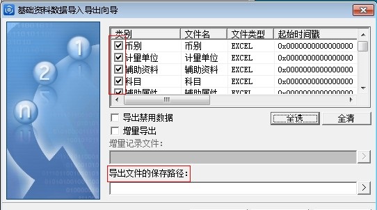 选择需要实现导入导出的基础资料,在对应的基础资料前划勾,选择导入文件存放路径录入文件名,然后单击【下一步】