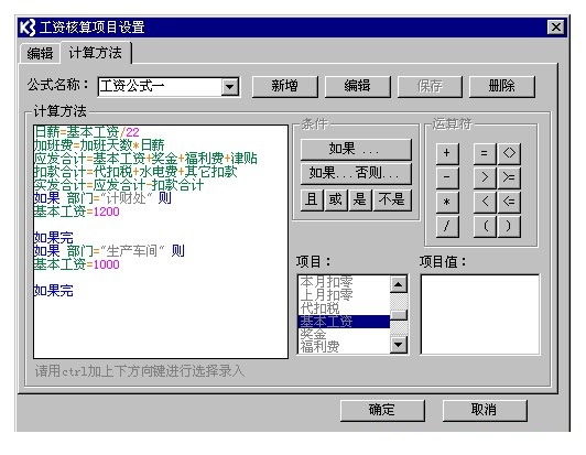 在设置完计算方法后保存时系统会做公式的检查,如果公式不符合要求则会有相应的提示。设计算方法时可通过条件下的按钮设置较复杂的工资计算方法。