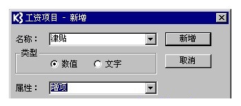 (1) 工资项目可新增, 删除 ,修改.  。增加项目的时候要注意,如果是要参与工资的加减核算的项目,一定要定义为数值的类型.如下图: