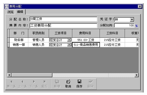 3. 工资费用的分配. 可根据不同的职员类别把职员的工资计入到不同的费用科目中, 并让系统根据设定的分配方案产生一张工资费用分配的凭证.   如下图: