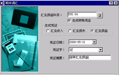 需要说明的是期末调汇可根据用户的需要分别生成汇兑收入凭证、汇兑损失凭证或汇兑损益凭证生成转账凭证的凭证日期,凭证字以及凭证摘要的内容,