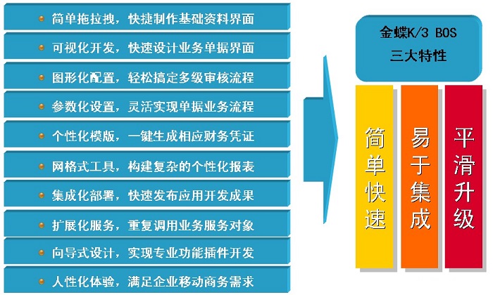 金蝶K/3 BOS通过集成开发工具、万能报表工具和数据传输工具,可以帮助客户实现从业务建模、流程配置、数据集成、设计开发到测试部署等一体化设计,快速构建集成的、可扩展的企业应用,满足企业持续成长的信息化需要。