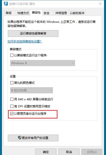 如果需要使用普通管理员用户登录操作系统使用金蝶软件,请选择桌面金蝶图标,鼠标右键,属性,兼容性,勾选“以管理员身份运行此程序”,确定,打开软件,选“是”