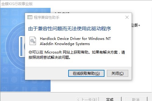 客户端安装最后一步智能卡驱动报兼容性问题,请点关闭按钮;如果使用的是智能卡加密请到金蝶注册网站(reg.kingdee.com)左下角下载“智能卡最新驱动程序”安装最新驱动;如果使用的是硬盘许可,可以不安装最新驱动。