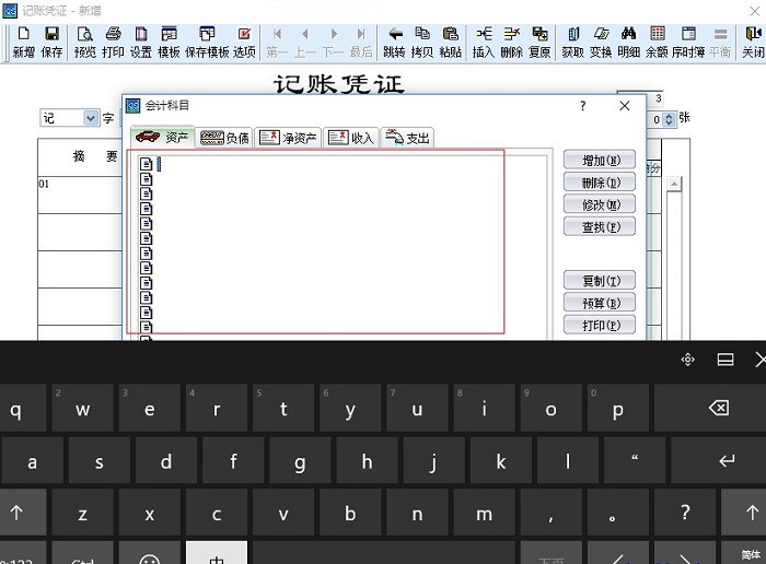 使用触摸键盘时,会计科目会显示空白,此问题暂时只能停用触摸屏: