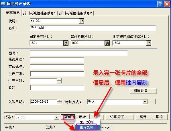 在显示的功能项中,选择批内复制,在弹出的窗口中录入希望增加的固定资产卡片张数: