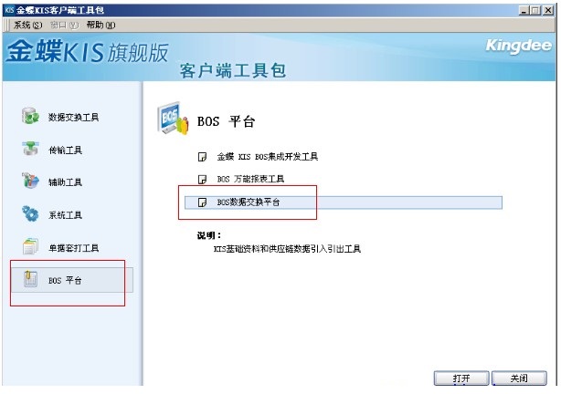 1、在主控台界面点击左上角菜单栏【系统】下的【客户端工具包】后,打开【客户端工具包】界面。点击左边的【BOS平台】,然后双击右边的【BOS数据交换平台】,弹出系统登录界面,选择对应的账套,输入用户名和密码;