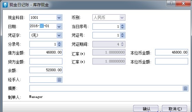 1月份的现金初始余额为5200,需要调整为52000。账套当前会计期间为2月份,由于企业业务需求,否决第一种方案,选择在当前期间做现金日记账调整。如图-5,-6所示: