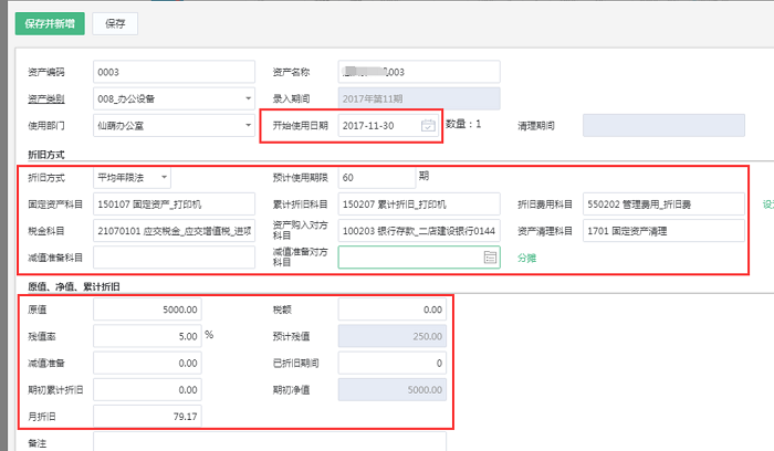 值得注意的是卡片数量默认为1,如果是多台固定资产的话,需要增加好卡片之后点击复制,录入卡片后,可以在卡片界面右上角点击生成新购凭证,系统会自动生成在【结账】模块生成计提折旧凭证