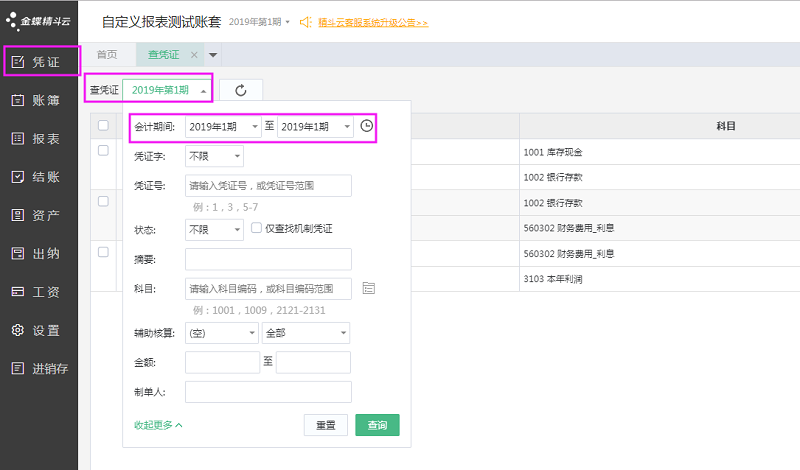 1、【凭证】-【查凭证】左上角均可以选择会计期间查看期间数据,可以在此选择相应的会计期间查看历史数据;