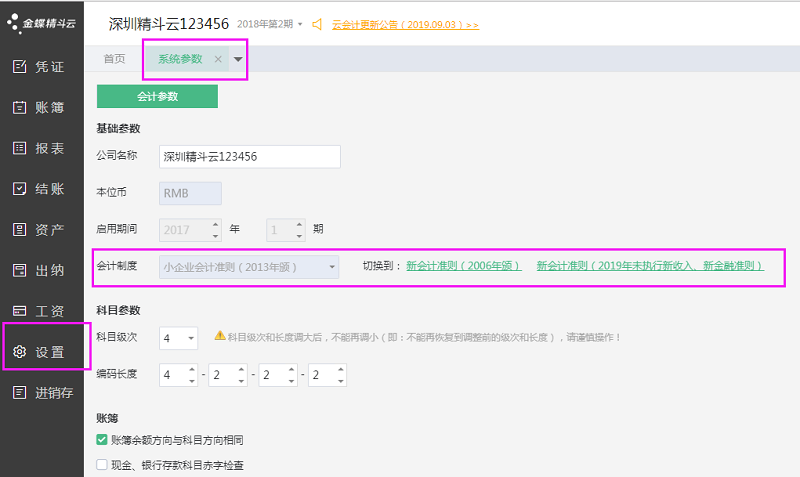 创建账套后,可在设置:系统参数,会计制度切换;新会计准则(2006年颁)和小企业会计准则(2013年颁)、新会计准则(2019年未执行新收入、新金融准则)之间可进行切换。
