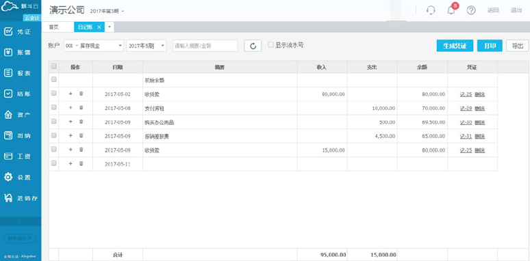 出纳账户和会计账户是独立的,出纳账户用于维护日记账的账户。录入时只需选择对应的账户、期间,录入日期、摘要、金额即可。首次录入时可根据实际情况录入初始余额。录入一笔后,直接回车进行下一笔的录入。