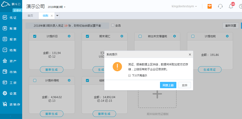 云会计凭证、资产负债表、利润表可上区块链,经用户同意上链后,凭证在系统自动过账时上链,报表在结账和报税时上链。