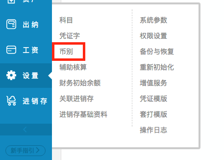 企业在对外贸易中,往往会涉及外币业务,按不同的币别记录业务数据,可以使得业务核算更为准确。在系统启用时,已经设定好记账本位币。如果需要处理外币业务,则需要增加其他的币别,并维护其汇率。 系统启用后,只允许修改记账本位币的名称,“编码”和“汇率”都不能修改。本位币和已发生业务的币别都不能被删除。 在系统主界面,点击“设置”,选择“币别”,进入“币别”页面。
