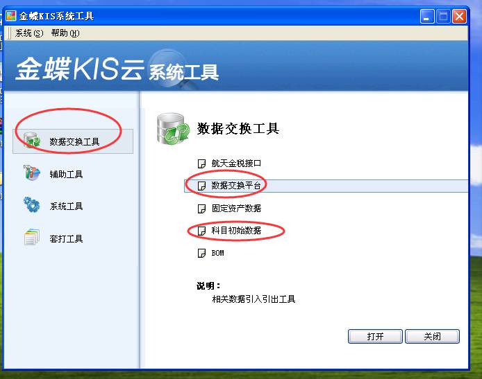 金蝶系统工具1、数据交换平台:引入和导出,先导出科目、部门、职员、仓库、客户、供货商,再引入科目、客户、供货商等。
