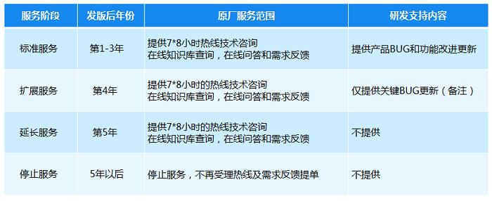 3即使续签运维服务也仅能获取有限的服务支持,不再提供系统修复补丁、产品需求补丁、新产品许可更新等服务