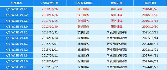 备注2:历史已发布版本仍按原服务生命周期8年执行,自K/3 WISEV15.0起按5年执行