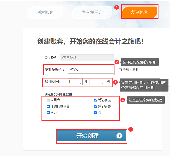 3.选择需要复制的账套,如需和复制账套的启账期间不一致,则可修改对应的启用期间;如是复制一整个完整的账套,需勾选【全账套复制】