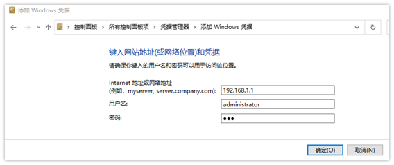 3、在添加windows凭据界面,分别输入正确的服务器IP地址或计算机名、服务器管理员用户名和密码,点击“确定”完成