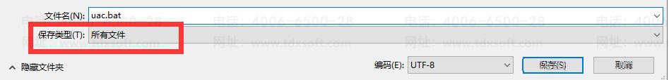 2、另存为操作时,在名称后面加一个 .bat ,然后下方的文件类型选择为“所有文件”,之后点击“保存”即可,如下图所示。